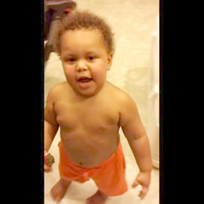 A woman says "so what are we having for lunch today" to her tot boy, and he says "the new shake" but then knocks it over on the counter and says "uhh... cancel that."
