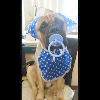 A Boxer dog sucks on a pacifier while dressed up as a baby for Halloween at home.