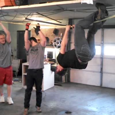 Two teen boys pull ropes to collapse a deck in the yard and part of it breaks, but the rest of it stays up. At 4:20, one of them uses an ax to break the support beam and the whole thing falls on him.