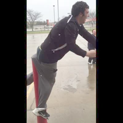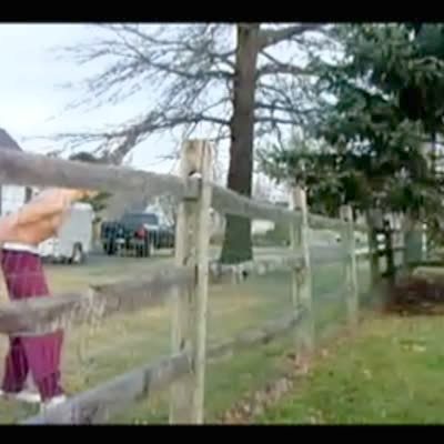 Teen boy hops over a fence in sweatpants and no shirt. He hops back and balances, the fence breaks and he falls. With recovery, he laughs.
