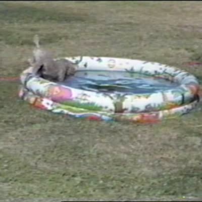 Two kitten lay on the kitchen floor behind another cat and they both swat at its tail while it wags it. Then at the end, the larger cat gets up and turns around and hits one of the kittens.