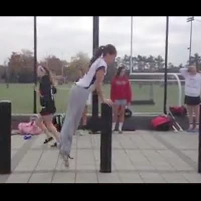 Teen girls take turns leaping over metal posts outdoors when one of the girls gets caught and flips over the post before falling to the ground.