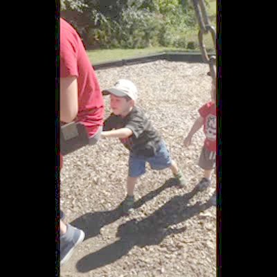 2 young boys take turns swinging on a rope/ vine. Small boy yelling like Tarzan gets knocked over by boy swinging.