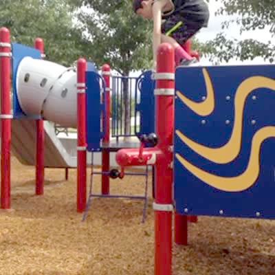 A boy climbs on a playground structure and does a back flip off of it. Another boy takes his turn and does it as well. The first boy climbs up to do it again at 2:05, but he slips and falls backwards and lands on his back.