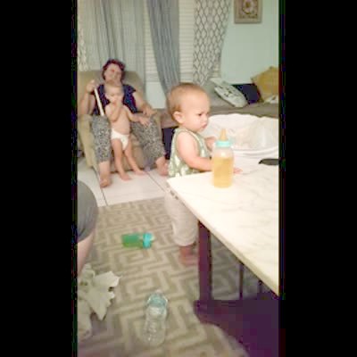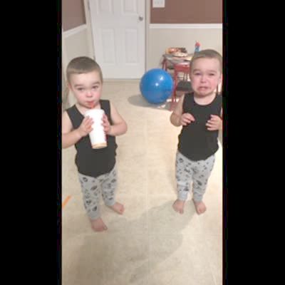 "Don't Care to Share" Twin tot boys take turns to share a drink in the living room and each time they hand it off to the other, they start to cry.