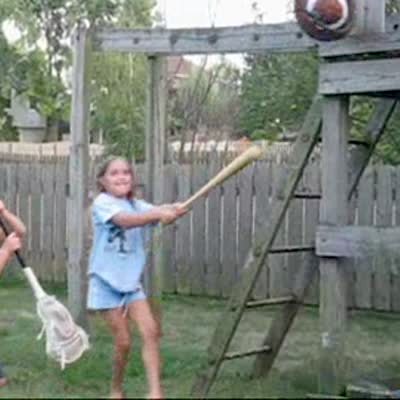 Young boy & girl take turns swinging at a pinata. Boy hits girl in the head with lacrosse stick.