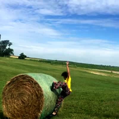 Two young men take turns running on a rolling bale of hay outdoors and both of them fall.