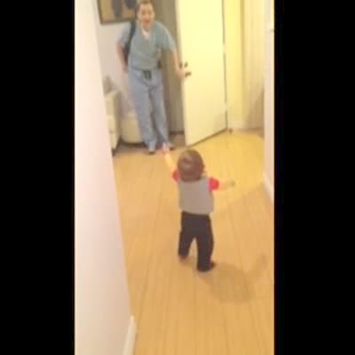 A baby boy smiles and holds his hands out for a hug while walking towards his dad but takes a sharp turn into the kitchen before reaching him.