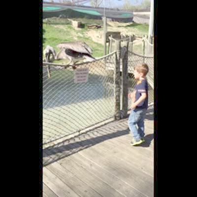 A boy walks carefully up to a pelican bird to take a picture next to it when the pelican turns around and bites him.