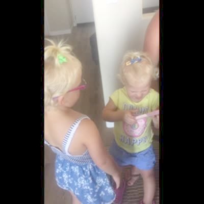 A tot girl holds a phone and takes a selfie picture. A young girl tries to take a picture with her, and the tot tells her "no". The girl waits, then asks the tot if it is her turn, repeatedly, and the tot repeatedly says "no".