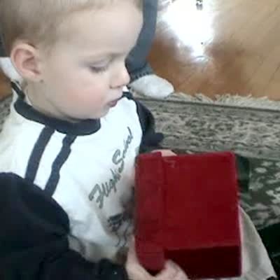 Tot boy sitting on living room floor as dad sets up Christmas tree takes big colorful ornament out of box, turns and throws it on hardwood floor and it shatters.