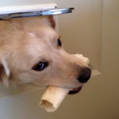 A dog with a bone in his mouth gets his head stuck in the cat's door that leads into a house indoors. As soon as he pulls his head out, a black dog pops his head in, and as soon as the black dog pulls his head out, a golden retriever dog pops his head in, and when he pulls his head out, the first dog pops his head back in.