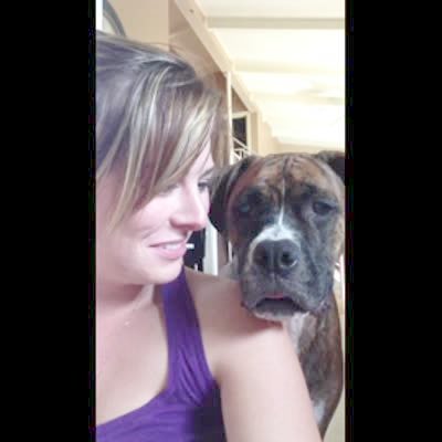 A woman and a Boxer dog indoors take turns sticking their tongues out at the camera.