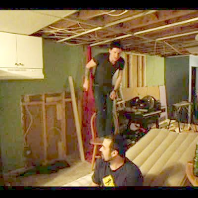 A man washes dishes in a kitchen while behind him a Dalmatian dog eats from a pot on the counter. The man behind the camera points and says "you have one job, look behind you," and the man turns to take the dog out of the food.