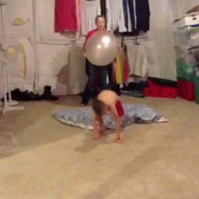 Several kids take turns running into a yoga ball while a young girl holds it. She runs out of the way and a boy runs into the wall behind her.