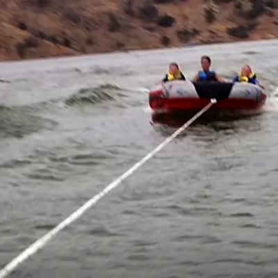 Three teen boys ride on a large float behind a boat. Two of the boys are flung off the float into the water when the boat takes a sharp turn.
