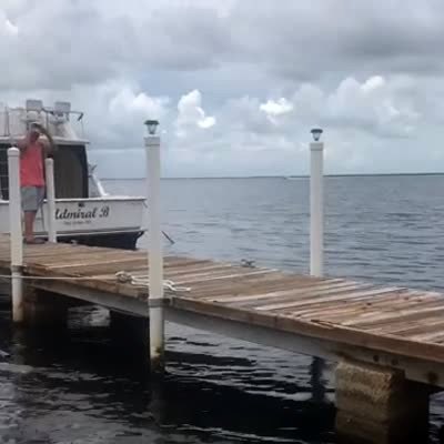 A young boy looks at a pelican on a pier. A woman holds a fish out for the pelican. A young girl in the background says how the pelicans can attack humans. At that very moment, the pelican turns his beak and snaps at the boy. Featured talent cleared only (young boy and bearded man taking photographs).