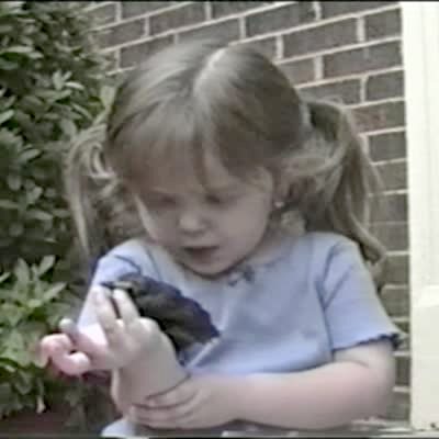 Bird sits on cute tot girl's arm, she talks to it. Bird poops on girl's arm, she screams. Short tail.