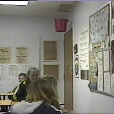 A teacher drops two balls simultaneously in front of a college classroom full of students, and one of the balls bounces off the table then hits her in the face. Featured talent cleared (woman on the table).