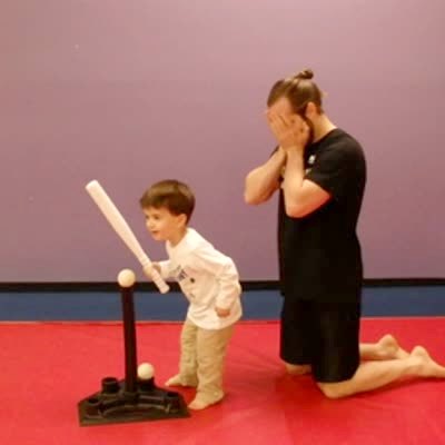 A tot boy learns to hit a t-ball with a bat indoors. When his teacher tells him to keep his "eye on the ball", he actually tries to put his eye onto the ball.