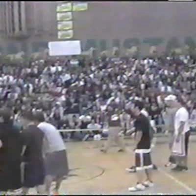 Teen boy tries to jump off his friend's back to slam dunk a basketball over his teacher. He slips & falls into man hard. Knocks him off chair onto the court. With recovery. High school gym.