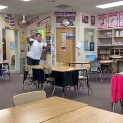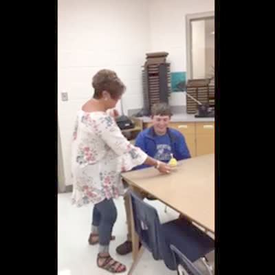 People sing "Happy Birthday" to a teen boy in a classroom and then one of them blows an air horn off screen as a prank and the boy gets so scared that he falls out of his chair.