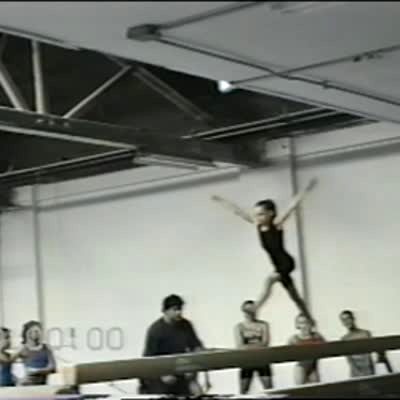 Gymnastics teacher man racks groin on balance beam. No tail. .