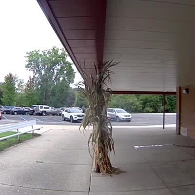 A man watches as a squirrel runs through a hall at school, then jumps out the window and lands in a bush.