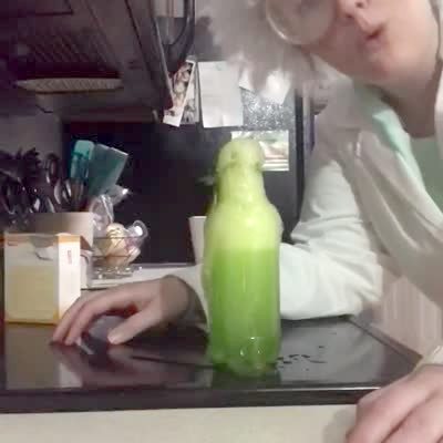 A woman shakes a bottle as the liquid inside makes a chemical reaction, then she unscrews the lid and the liquid fizzes. She says she's disappointed, then shakes the bottle again and it explodes in her kitchen.