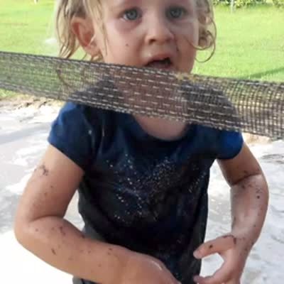 A young girl runs in the yard and trips and falls into a mud puddle. She gets up and tells her mom that she "got dirt." Then she runs to her dad to tell him what happened.