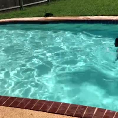 A young boy jumps in a swimming pool. A woman tells the family dog to help the boy. The dog jumps in the water and instead stands on the boy's back.