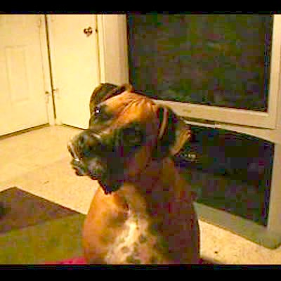 Boxer dog tilts its head from side to side when man talks quietly to him.