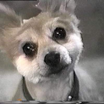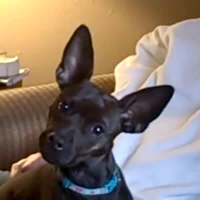 Woman has Chihuahua dog on her lap. Dog tilts its head from side to side as man talks to her.