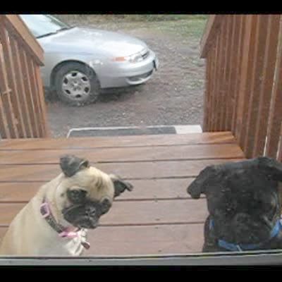 2 pug dogs wait to come into the house, they tilt their heads as woman asks them questions.