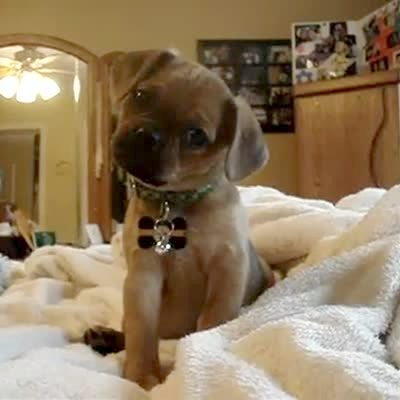 Pug puppy dog tilts its head back and forth when someone whistles.