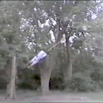 Red-haired boy gets spun really fast in a tire swing by his friends. He wants to get off but can't. Dizzy.