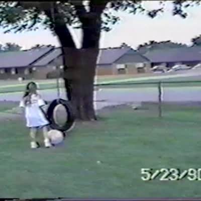 Man pushes girl in tire swing, it hits little boy in the head and knocks him over very hard. Really rough hit, no tails or recovery.