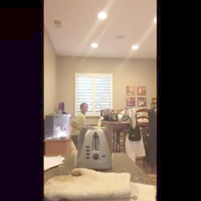 Tot girl on counter is scared when toaster pops toast out. Short tail.