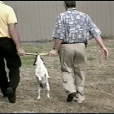 Dog holds and bites a stick that 2 men carry. *not much audio