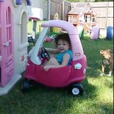 A tot girl gets a toy Power Wheels car for her birthday, but she runs right past it towards a balloon in the neighbor's front yard.
