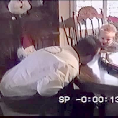 A young boy with boxing gloves pretends to do a training montage in the living room while "Eye of the Tiger" plays. He punches the bag, but slips and falls. Music rights not cleared.