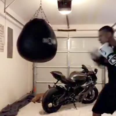 A man boxes in a garage and the boxing bag falls down and the ceiling falls down. He curses at the end.