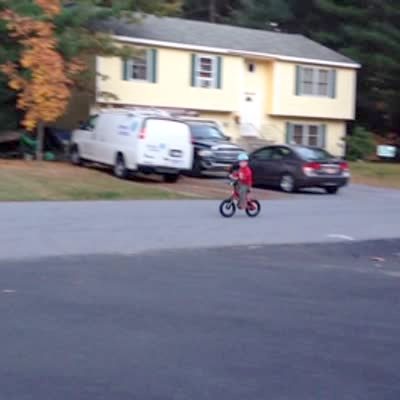 A tot boy rides a bike with no training wheels outdoors and crashes directly into a mailbox.