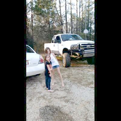 Two young girls pose for a picture and a very loud truck horn sounds behind them. The girls scream and run. scare