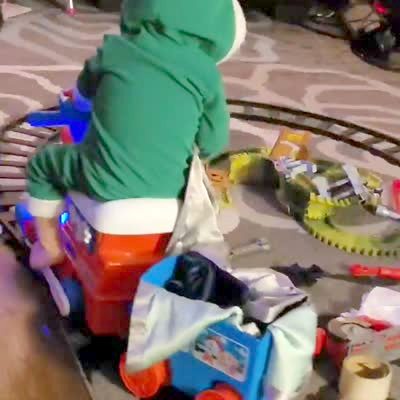 A tot boy rides a toy train in the living room in a Christmas elf outfit. Then both the boy the train fall over.