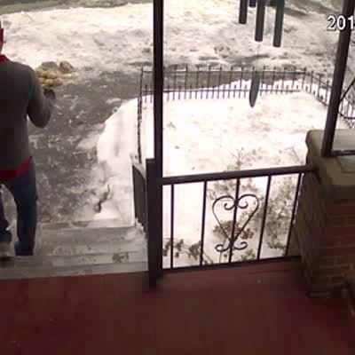 Security camera footage of a man who carries a tray of food in each hand while he walks down the stairs of the front porch and then slips on ice and falls.