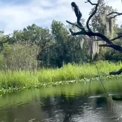 A woman jumps from a tree into a pond. She lands on the water, flat on her back, hard.