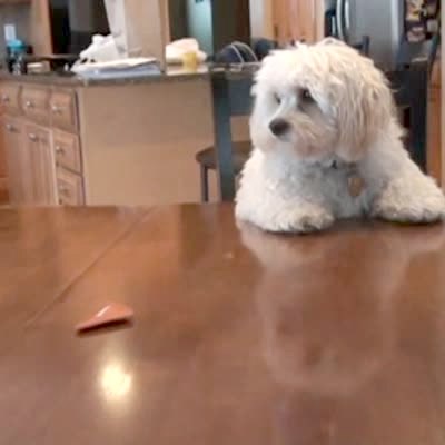 A small white dog falls off of a dining table while a boy and a man play with a triangle paper. Action is at :54