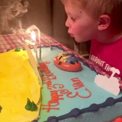 A young boy tries to blow out his trick birthday candles and gets scared.