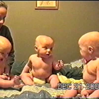 Triplets/baby boys sit on their bed in their diapers and yell at each other.